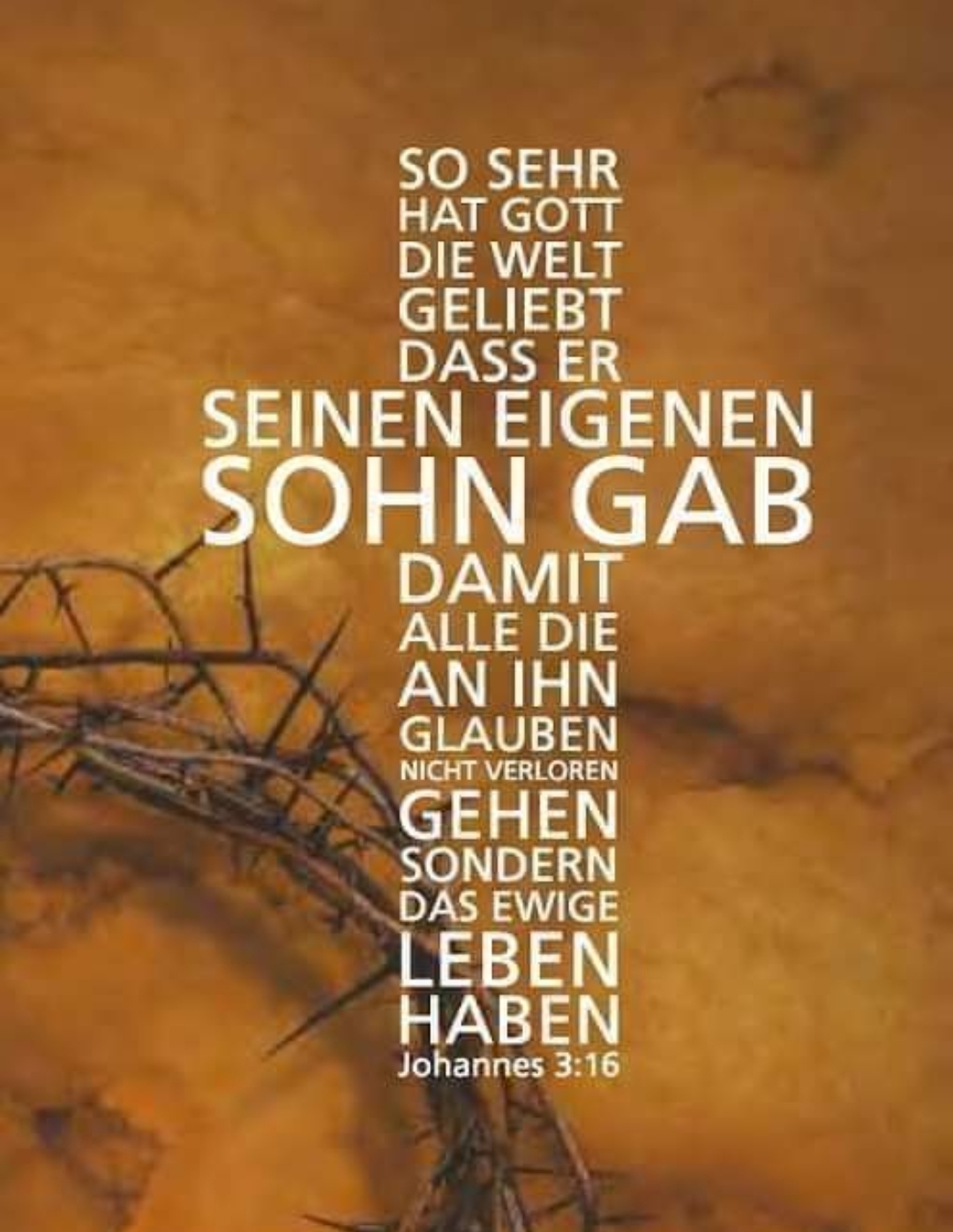 Johannes 3,16: “Denn so hat Gott die Welt geliebt, daß er seinen eingeborenen Sohn gab, damit jeder, der an ihn glaubt, nicht verlorengeht, sondern ewiges Leben hat.”
